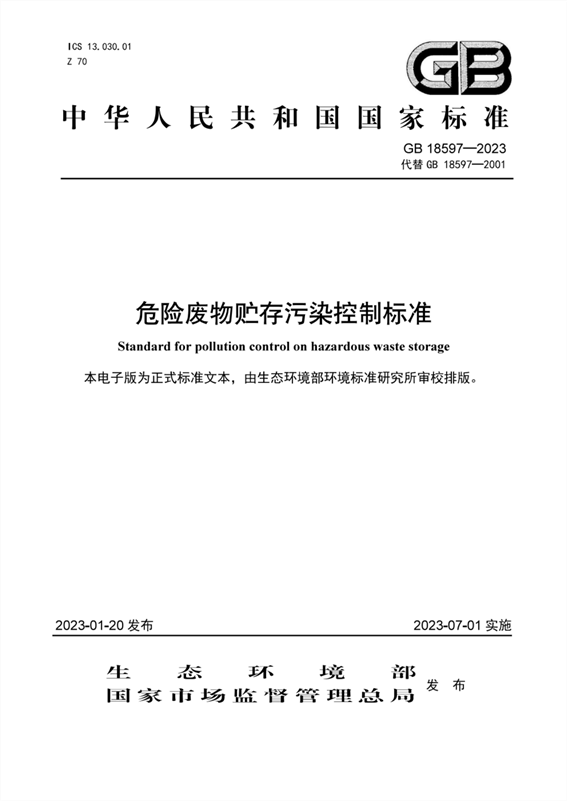 本标准自2023年7月1日起实施。自本标准实施之日起,《危险废物贮存污染控制标准》(GB 18597 —2001)废止。各地可根据当地生态环境保护的需要和经济、技术条件,由省级人民政府批准提前实施 本标准。
