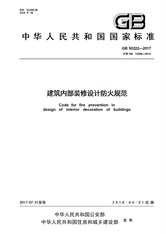 《建筑内部装修设计防火规范》GB 50222-2017,经住房城乡建设部2017年7月31日以第1632号公告批准发布。