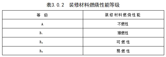 3.0.2 装修材料按其燃烧性能应划分为四级,并应符合本规范表3.0.2的规定。