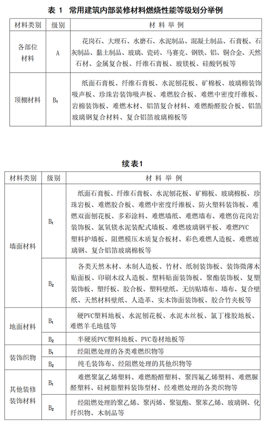 为方便设计单位借鉴采纳,本规范对常用建筑内部装修材料燃烧性能等级划分进行了举例。表1中列举的材料大致分为两类, 一类是天然材料, 一类是人造材料或制品。天然材料的燃烧性能等级划分是建立在大量试验数据积累的基础上形成的结果;人造材料或制品是在常规生产工艺和常规原材料配比下生产出的产品其燃烧性能的等级划分同样是在大量试验数据积累的基础上形成的,划分结果具有普遍性。