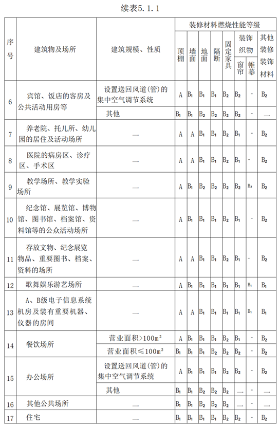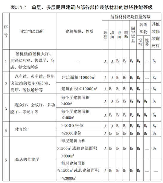 5.1.1 单层、多层民用建筑内部各部位装修材料的燃烧性能等级,不应低于本规范表5.1.1的规定。