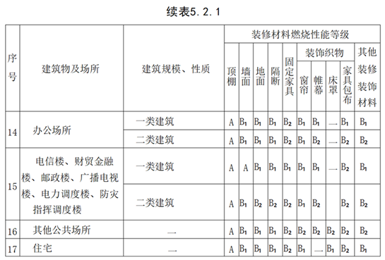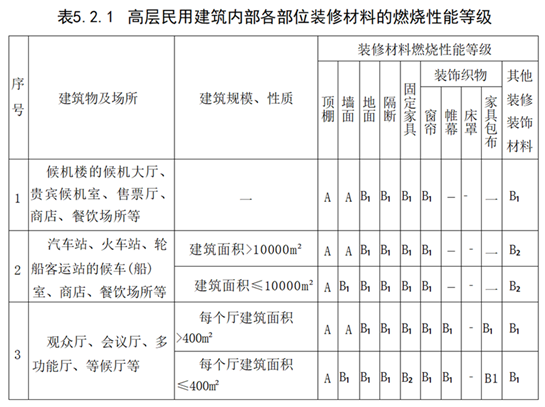 5.2.1 高层民用建筑内部各部位装修材料的燃烧性能等级,不应低于本规范表5.2.1的规定。