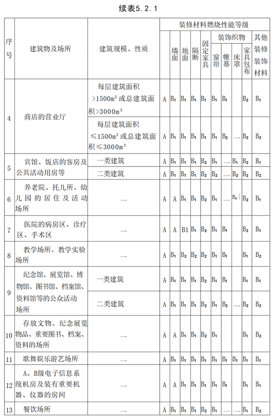 5.2.1 本条为强制性条文。表5.2.1中建筑物类别、场所及建筑规模是根据现行国家标准《建 筑设计防火规范》GB 50016有关内容结合室内设计情况划分的。其内部装修材料防火等级 强制执行,以规范高层民用建筑的材料使用,减少火灾发生。