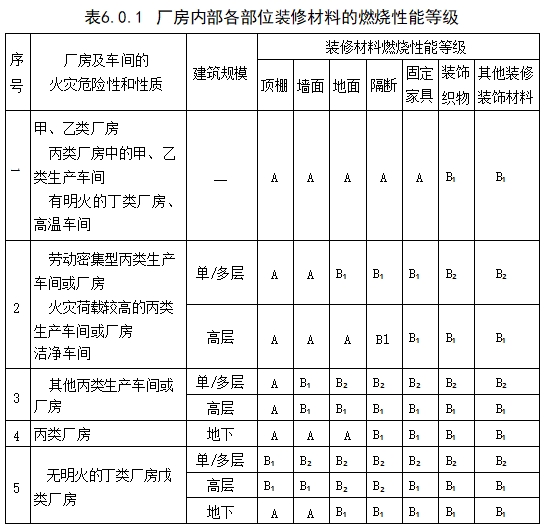 6.0.1 厂房内部各部位装修材料的燃烧性能等级,不应低于本规范表6.0.1的规定。
