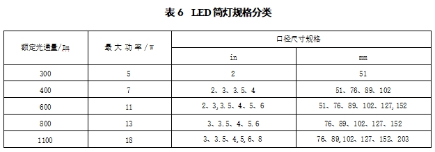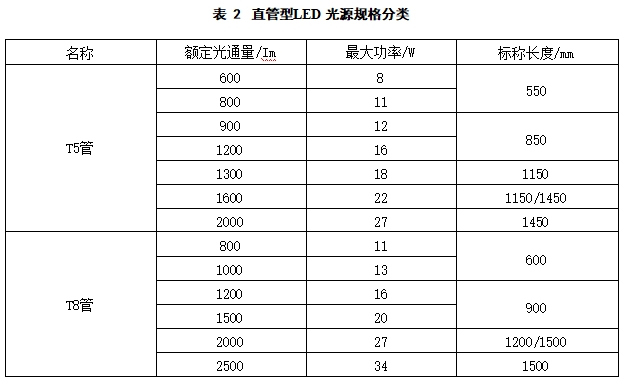 5.1.4 直管型LED 光源规格根据额定光通量宜按表2分类。