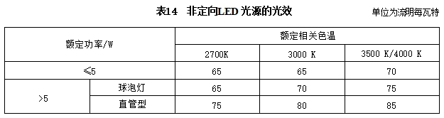 6.2.2 非定向LED 光源的初始光效不应低于表14的规定,