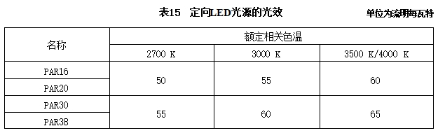 6.2.3 定向LED 光源的初始光效不应低于表15的规定。
