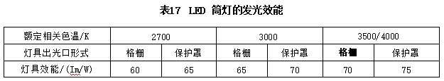6.3.2 LED筒灯的发光效能不应低于表17的规定。
