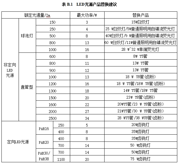 LED 光源替换传统照明产品宜符合表B.1的规定。
