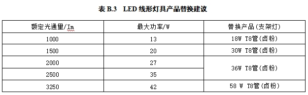 B.2.2 LED线形灯具替换传统照明产品宜符合表B.3 的规定。