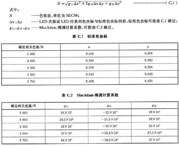 6.1.5 LED光源和LED 灯具在不同方向上的色品坐标与其加权平均值偏差在GB/T 7921—2008规 定 的CIE 1976均匀色度标尺图中,不应大于0.004.
