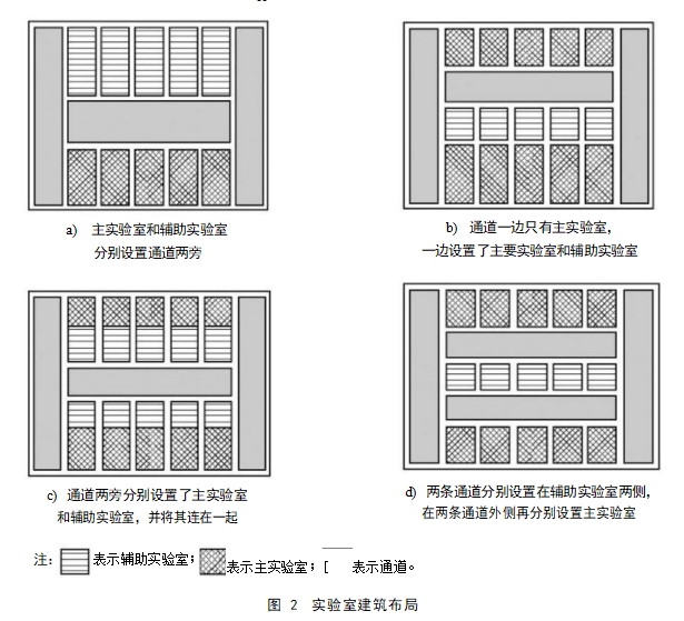 在主要实验室与辅助实验室之间设置了两条通道,辅助实验室设置在两条通道之间,主要实验室设 置在两条通道的外侧,辅助实验室的深度比主要实验室的深度浅。其特点有利于空调面积较多的实验 室,可以节约能源,室内温度波动小。同时由于建筑物加大了进深,可以节约用地,建筑物内管网也易于 集中,各实验室间交通相对缩短。它的特殊形式是环形通道,适宜于洁净要求高的高纯度实验室,同时也有利于事故发生时人员疏散[见图2d]]。