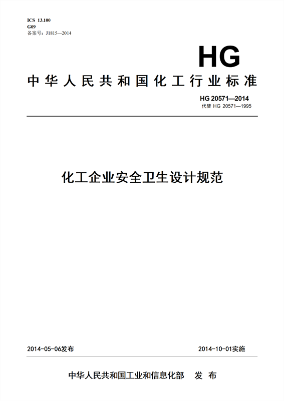 《化工企业安全卫生设计规范》 HG 20571-2014, 经中华人民共和国工业和信息化部2014年5月6日以第32号公告批准发布。本规范是在《化工企业安全卫生设计规定》HG 20571—1995的基础上修订而成,上一版的主编单位是中国天辰工程有限公司(原化工部第一设计院),主要起草人是付均鸠等。本次修订的主要技术内容是:1.增加了第2章术语;2.对洗眼器和安全淋洗器的供水和排水提 出了要求;3.对辅助用室按照现行国家标准《工业企业设计卫生标准》GBZ1 进行了调整;4.安全卫 生管理机构配备原则按照国家安全生产监督管理总局的最新规定进行了调整;5.删除医疗卫生机 构设置的描述,只保留职业病防治机构的描述;6.化工建设项目安全设施设计专篇和职业病防护设 施设计专篇已经分开报批,因此,原规范要求编写的安全卫生专篇已由两个独立的“安全设施设计专 篇”和“职业病防护设施设计专篇”替代。删除了原规定附录1有关“建设项目职业卫生专篇内容深 度规定”的内容;7.增加了与《危险化学品安全管理条例》规定的8类敏感目标保持有关标准或规范 所规定的安全距离的要求。本规范修订过程中,编制组总结了我国工程建设安全卫生设计领域的实践经验,同时参考了先 进技术法规、技术规范,广泛征求了中石油东北炼化吉林设计院、中海油天津化工设计研究院、中国 石化上海工程有限公司、上海福陆工程公司、赛鼎工程有限公司、惠生工程(中国)有限公司、东华工 程科技股份有限公司等11家单位的意见,取得了安全卫生设计、报批程序、验收等大量技术资料。为便于广大设计、施工、科研、学校等单位有关人员在使用本规范时能正确理解和执行条文规 定,《化工企业安全卫生设计规范》HG 20571-2014编制组按章、节、条顺序编制了本规范的条文说 明,对条文规定的目的、依据以及执行中需注意的有关事项进行了说明,并对本规范强制性条文第 5.1.6条和第5.6.5条的强制性理由做了解释。但是,条文说明不具备与规范正文同等的法律效力, 仅供使用者作为理解和把握规范规定的参考。1.总 则1.0.1 本条款旨在体现化工建设项目工程设计中“以人为本、安全第一、预防为主、综合治理”和“预 防为主、防治结合”的理念。随着现代化科学技术飞速发展和工业生产规模日益大型化,安全卫生也 引起了人们的普遍关注。在化学工业贯彻安全生产方针,加强职业危害的防治工作,对保障职工的 安全和健康,促进化学工业的发展具有重要的意义。化学工业的基本建设和技术改造项目,其职业性危害因素的治理和安全卫生技术措施和设施, 应与主体工程同时设计、同时施工、同时投入生产和使用。“三同时”反映了劳动保护与经济建设相 辅相成的客观规律,贯彻“三同时”,设计是关键,只有设计按照规定执行,才能从根本上改善劳动条 件。安全卫生设计规范就是使设计人员按照规定设计,使工程设计达到技术先进、经济合理、安全可靠。1.0.3 化工工程设计包括多个专业,只有各个专业都认真执行安全卫生标准,才能使化工生产装置 更具有安全性。当安全技术措施与经济利益发生矛盾时,应优先考虑安全技术要求。1.0.4 根据我国建设程序的审批要求,化工建设项目应编制“安全设施设计专篇”和“职业病防护设 施设计专篇”。国家安全生产监督管理总局发布了《危险化学品建设项目安全设施设计专篇编制导 则》(安监总危化[2013]39号)文。“安全设施设计专篇”应按此要求进行编制。国家安全生产监督 管理总局第51号令规定了“职业病防护设施设计专篇”的内容,“职业病防护设施设计专篇”的编写 应按此要求及相应的配套文件进行编制。1.0.5 本条款包含两方面内容: 一是在详细设计时应不断完善前一阶段的安全卫生方面有关的措 施和内容,落实安全评价和“安全设施设计专篇”、“职业病防护设施设计专篇”及其审批意见和初步 设计审查时提出的安全卫生方面的意见;二是经审查同意的安全设施设计方案、职业病防护设施设 计方案如有变动要报请安全监管部门同意。3.一般规定3.1 厂址选择3.1.1 化工企业厂址是化工生产与建厂地区自然及人文等多种条件结合的统一体,应根据建设地 区的自然环境和社会环境,拟建地区的地形、区域规划、工程地质、水文、气象、地震、交通运输、原、燃 料来源、产品去向等基础资料,在掌握各项现状与规划资料的基础上进行多方案论证、比较,选定技 术可靠、经济合理、交通方便、符合环境和安全卫生要求的厂址方案,并充分考虑危险品建设的特点 及其相关要求,两利权其重,两害取其轻,经过主管部门和社会认同,方能选出经济、社会和环境三大 效益较好的建厂地点。3.1.2 本条款提出建厂地区自然条件对工程建设和生产经营可能造成的影响,以此为厂址比较或 选定后采取相应措施的依据。忽视任一方面就有可能加大建设投资或在工厂建成后埋下隐患。3.1.3 为了保证企业不受洪水和内涝威胁,或实在不能避开时,应按标准确定场地高程或采取有效 的防洪、排洪措施,满足国家防洪标准的要求。对于化工企业可按现行国家标准《化工企业总图运输 设计规范》GB 50489和《工业企业总平面设计规范》GB 50187执行。3.1.4、3.1.5 考虑化工企业的自身安全,应该避开前三种地区。工厂对附近的文物保护、交通、气 象和大型文化