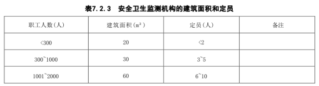 7.2.3 大中型化工建设项目和危害性较大的小型建设项目应设置安全卫生监测机构(站、组)。安 全卫生监测机构的建筑面积和定员可按照本规范表7.2.3配置。
