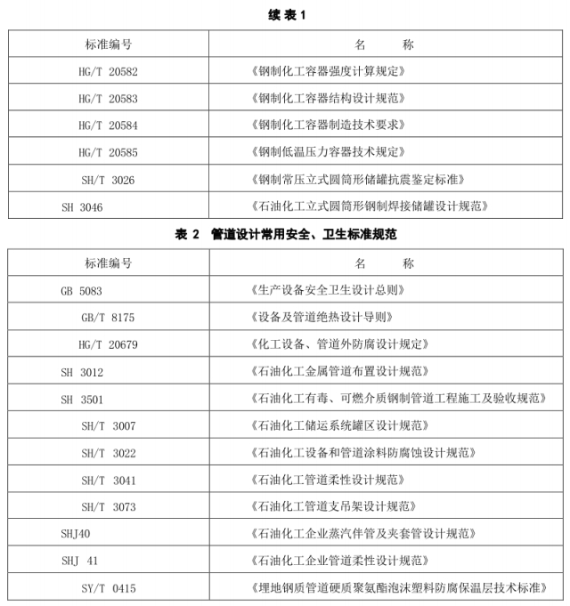 《建筑设计防火规范》GB 50016 《建筑采光设计标准》GB 50033《建筑照明设计标准》GB 50034《建筑物防雷设计规范》GB 50057《爆炸和火灾危险环境电力装置设计规范》GB 50058《交流电气装置的接地设计规范》GB/T 50065 《火灾自动报警系统设计规范》 GB 50116《石油化工企业设计防火规范》GB 50160 《电子信息系统机房设计规范》GB 50174 《防洪标准》GB 50201《建筑防腐蚀工程施工及验收规范》GB 50212《建筑物电子信息系统防雷技术规范》 GB 50343 《化工企业总图运输设计规范》GB 50489《石油化工可燃气体和有毒气体检测报警设计规范》 GB 50493 《石油化工装置防雷设计规范》GB 50650《危险货物包装标志》GB 190《安全色》GB 2893《安全标志及其使用导则》GB 2894《特低电压(ELV) 限值》GB/T 3805《固定式钢梯及平台安全要求》GB 4053《设备及管道绝热技术通则》GB/T 4272《生产设备安全卫生设计总则》GB 5083《生活饮用水卫生标准》GB 5749《气瓶颜色标志》GB 7144《工业管道的基本识别色、识别符号和安全标识》GB 7231《电磁辐射防护规定》GB 8702《激光设备和设施的电气安全》GB/T 10320 《防止静电事故通用导则》GB 12158《危险货物品名表》GB 12268《消防安全标志》GB 13495《化学品分类和危险性公示通则》 GB 13690《化学品安全标签编写规定》GB 15258《电离辐射防护与辐射源安全基本标准》GB 18871 《工业企业噪声控制设计规范》GBJ 87《工业企业设计卫生标准》G BZ 1《工作场所有害因素职业接触限值》GBZ 2《含密封源仪表的放射卫生防护要求》GBZ 125《工作场所职业病危害警示标识》GBZ 158《高毒物品作业岗位职业病危害告知规范》GBZ/T 203 《化工企业照明设计技术规定》HG/T 20586《化工企业静电接地设计规程》HG/T 20675《石油化工储运系统罐区设计规范》SH/T 3007《石油化工企业卫生防护距离》SH 3093《气体防护站设计规范》SY/T 6772中华人民共和国化工行业标准